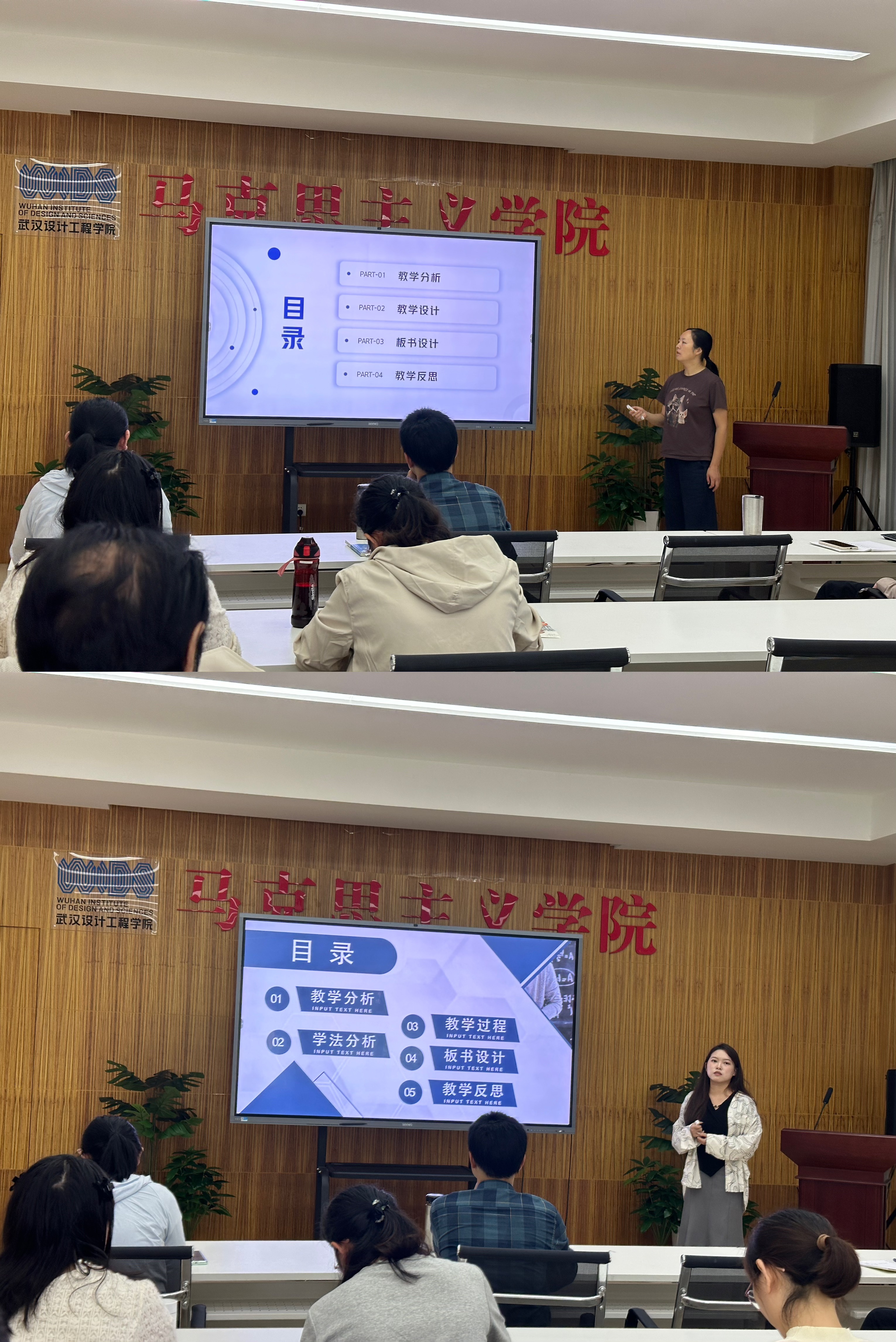 此次集体备课会聚焦“五个基于”的教学设计理念,即基于学习动词的教学流程设计、基于逻辑框架的板书设计、基于问题链式的有效互动设计、基于专业的分众教学设计、基于AI的创新性教学设计。会上,来自四个教研室的八位教师分别进行了精彩的教学设计展示与分享。