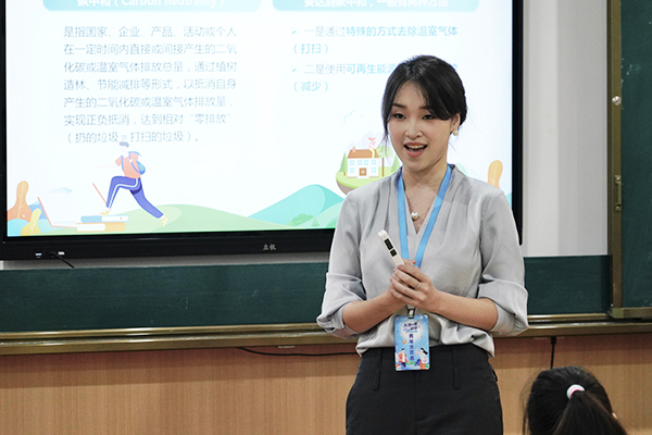 “小朋友们,你们知道一包薯片袋子在地下要躺多少年才能完全消失吗?”宣讲员周嘉妮开场刚抛出这个问题,孩子们的好奇心一下子就被点燃了。紧接着,可爱的卡通短片登场,原本抽象难懂的“碳中和”概念,瞬间变得鲜活起来。宣讲员还结合孩子们熟悉的生活例子,把节能减排、垃圾分类这些环保行为和“碳中和”联系在一起,听着简单,记起来却特别深刻。