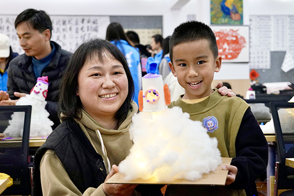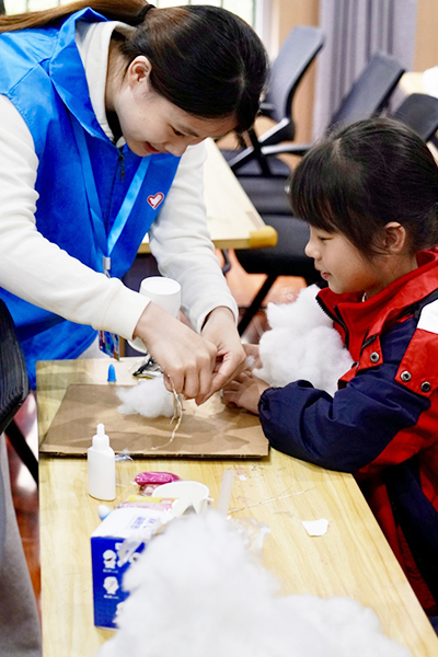最温馨的时刻,要数亲子手工环节。在志愿者的指导下,家长和孩子们一起动手制作“低碳火箭”。纸杯、棉花、橡皮泥这些常见的简单材料,在亲子的共同协作下,变成了一个个承载绿色梦想的艺术品。孩子们用稚嫩的小手,在纸杯上认真地装饰着绿树、太阳和云朵,家长们则在一旁耐心协助,活动室里满是温馨与快乐。