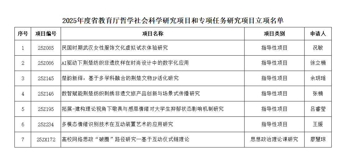 本网讯(通讯员 袁向旸)近日,湖北省教育厅公布了2025年度哲学社会科学研究项目及专项任务项目立项名单。我校共有7项课题获准立项,其中,我院廖慧琼老师申报的《高校网络思政“破圈”路径研究—基于互动仪式链理论》成功获批“思想政治理论课研究”专项。