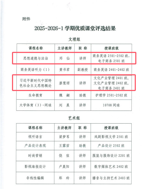 本网讯(通讯员 袁向旸)近日,学校2025-2026-1学期优质课堂评选结果揭晓。我院邓仙老师主讲的《思想道德与法治》、廖慧琼老师主讲的《习近平新时代中国特色社会主义思想概论》两门课程双双入选,在全校10个优质课堂中占据两席,充分展现了学院思政课教学的过硬实力与育人风采。