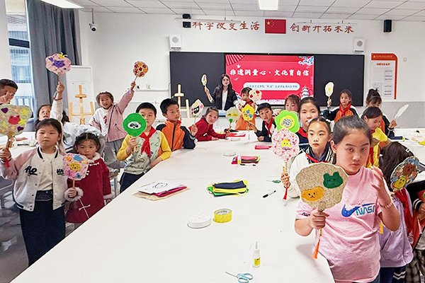在手工实践环节,宣讲团为孩子们准备了彩色布片、空白扇面、环保胶棒等安全材料。在教师与志愿者的分组指导下,孩子们化身“小小非遗传承人”,认真完成布片裁剪、纹样拼接、粘贴固定等步骤。稚嫩的双手专注创作,一件件充满童趣又兼具传统韵味的布贴扇面相继完成。