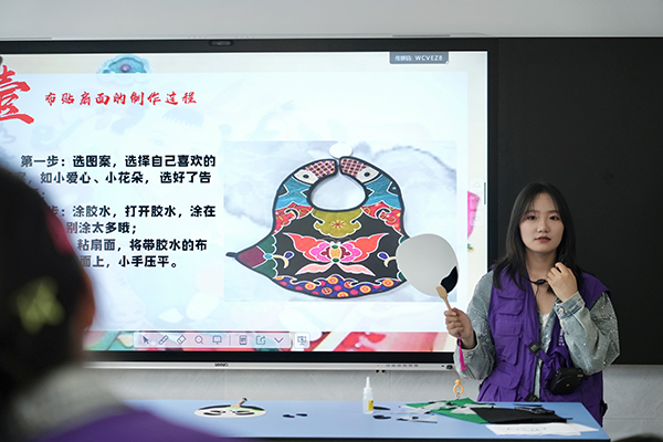 活动中,由时尚设计学院志愿者组成的红“设”宣讲团成员以图文展示、案例讲解等形式,向孩子们系统介绍阳新布贴的历史渊源、艺术特征与文化内涵。从“黑漆点金”的独特审美、“变废为宝”的民间智慧,到代代相传的传承脉络,宣讲团用通俗易懂的语言,将非遗知识转化为贴近儿童认知的生动故事。