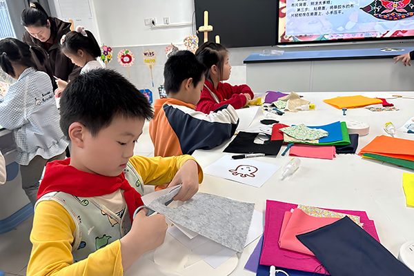 “我贴了一条小鱼,老师说是代表年年有余!”“我学会了用碎布片拼出大红花,太有趣了!”孩子们现场展示作品、分享创作心得,在动手实践中近距离感受传统工艺之美,进一步加深对中华优秀传统文化的理解与认同,文化自信在实践体验中悄然根植。